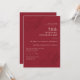 A chic modern design with an elegant edge, this modern minimal 50th Wedding Anniversary invitation features beautiful calligraphy script monograms of the husband and wife on alternating corners. A crisp text layout displays the details of your event with a clean classic look sophisticated styling with large monogram initials and ivory beige text over a rich cranberry red background. Replace the sample text with your information. You may move your initials slightly left or right, up or down to accommodate their best display in this design format. The monograms look best when they run slightly off the edges. Change any wording on the invitation to suit your personal style and preferences. The back of the invitation is in the matching cranberry red colour.