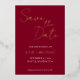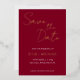 Simple, gold foil print wedding Save the Date card with white, stylised script on cranberry red colour background. Edit names and date, etc, with your own wedding information. Change foil colour if desired. Background colour may be changed as well to match your wedding colour scheme.