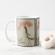 A whooping crane extends its neck upward to reach an oversized orchid in the Asian-inspired design on this mug. The crane is marked with black on its neck and wings and with red on its face and head. The phalaenopsis orchid is pale orange with deep green leaves at the base of its arcing stem. The deep beige background and distressed appearance give the image the look of an antique painting on paper that has faded over the course of time. From my original digitally created image.