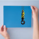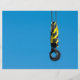 Crane hook with yellow and black stripes hanging, blue sky in background