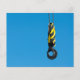 Crane hook with yellow and black stripes hanging, blue sky in background