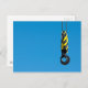 Crane hook with yellow and black stripes hanging, blue sky in background