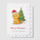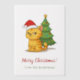 Grumpy looking orange tabby cat is wearing a red Christmas hat. Small Christmas tree behind it. Customizable text.