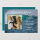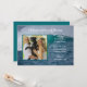 Anniversary party invitation with photo of the couple. Crashing ocean waves design with white, Old English style font - change it in the customise area. A bold line of text at the top for years of marriage. All party information is added using a paragraph template. Upload a photo, either horizontal or vertical, with subject in the centre. The square photo template is outlined in white. Reverse is solid blue-green colour.