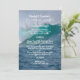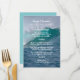 Ocean waves wedding menu template. Bold white, handwritten font is printed over a crashing wave background on your choice of speciality paper. Names of the couple at the top with “wedding menu” text. All menu items are added in paragraph form. Add or remove spaces as needed. The sample menu wording uses uppercase lettering for the title of each section.