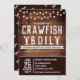 This rustic brown design features a rustic wood background with string lights and crawfish graphics. This invitation is great for graduations, but the text can also be customised for birthdays, weddings, family reunions, and any other party you may have a crawfish, crayfish, crab, or lobster boil at. Enjoy your crawfish and seafood boil!