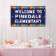School welcome banner with row of crayons at the bottom and the top! Perfect for entry doors, door to office, or to hang at festivals, fairs and educational programs. See our classroom welcome doormats as well.