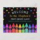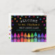 Welcome postcard for your new students personalised with the teacher's name beneath colourful stars and above a row of crayons in a rainbow gradient. Kindergarte welcome postcard with colourful crayons and stars against a black background. Welcome to school postcard personalised with the teacher's name in a playful yellow font.