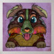 Unique crazy Australian Shepherd dog face with bold, colourful abstract patterns on a lilac background. Popular with dog lovers and pet lovers and rescue dog lovers.