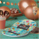 Paper plates with an adorable repeating pattern. A whole lot of frisky kitty cats. Rolling, tumbling and stretching. The background colour is a gradient green. Text layered over top says "Crazy Cat Lady" with a cute orange tabby laying on his back above the text.