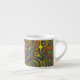 A cool Espresso Mug, with an abstract pattern of crazy swirls in shades of dark, blue, dark green and brown with golden yellow highlights.