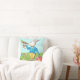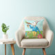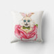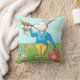 Art by artist Kristie Hubler, white rabbit blowing on carrot horn, gerbera daisy timepiece clock with spinning, out of control hands on one side of pillow, goofy rabbit popping up out of tea rose teacup on the other side