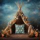 A bold, maximalist cream and blue floral vintage inspired Art Nouveau pattern on a dark blue background