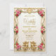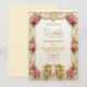 This design features a sophisticated flat digital illustration simulating the look of high-end printing techniques. The artwork showcases a faux gold foil effect on the filigree borders and monogram crest, creating a shimmering metallic appearance without actual raised foil. The background simulates a rich cream or off-white paper texture, complemented by soft blush pink roses and intertwined green foliage.This is a flat printed image with a printed faux texture effect, not actual raised material or real gold foil.