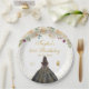 This elegant and glamourous birthday party plate features a beautiful princess with dark hair and dark skin in a black ball gown. The text combines handwritten script and modern sans serif fonts for a classy and sophisticated look. The floral arrangements, butterflies and gold confetti create the perfect blend of rustic and chic.