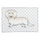 Destei's original cartoon illustration of a cute long hair cream coat colour Dachshund breed dog. The background has a pattern of grey dog paw prints.