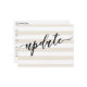 Using a handwriting script font that's just the right kind of messy, I created a graphic depicting "update". This appears over a soft cream and white stripe pattern. The background was overlaid with a plain white stripe graphic that allows your chosen colour to show through. Just change the background to any colour you prefer, if you'd like something different. The reverse side includes template placeholders for your details with matching accents featuring the calligraphy font. Use these template fields to add your personal details and change my draught wording to suit your needs and situation. Other pieces are available in the set and I'm happy to create additional variations upon request. // 9 //