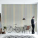 Dusty blue striped wallpaper. Thin vertical stripes in cream color over a blue-gray color.