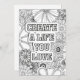 Ready-to-colour hand drawn illustration features "Create a life you love" text with doodle style floral background, and can be enhanced by sender or recipient. Sturdy cardstock can handle gel pens, markers, coloured pencils and more. Perfect for birthdays, thank you cards, or even to frame once it's been coloured.