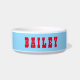 Create your own custom, personalised, bold christmas red rustic vintage western script / typography custom name at front and back, with three stars in the middle and light blue background, ceramic, pet dog cat doggy puppy kitten food bowl. Simply enter your pet's name / your text, to customise. Great for birthday, christmas, holidays, new years, and more, for pet dog / cat owners, friends, and family.