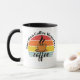 A customizable ceramic mug with a sunset and steaming coffee graphic, showing an example where personalized text can be added by the buyer.