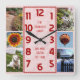 Make your own personalized photo collage clock with this easy template. This square clock has red numbers lined up in the middle in a deco-style long rectangle and a pink, slightly marbled background.