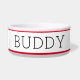 Design your own pet dish ceramic bowl with your choice of fonts and pick your own colours for the top and bottom stripe, text, and background to make a cat or dog bowl that matches your decor or animal's personality.
