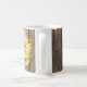 Pretty floral mug featuring watercolor sunflower with inspirational quote. The motivational quote says "Create your own Sunshine." The background is wood texture. Rustic and country design.