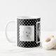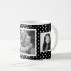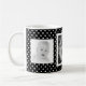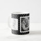 Upload your own square cropped photos to create a personalised photo mug. Works great with instagram photos, just download the ones you like using a program such as instaport! Black and white polkadotted background, with three square white framed photos. Looks great with b&w or colour photographs.