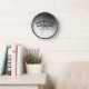 The size of the clock is dramatic and the abstract alcohol ink design is soothing and intricate at the same time. I chose the black frame that adds pop to the blue and gold design. The gold printing would be better in a slightly darker or larger font. I love it and I’m looking for just the right place in ny new apartment. I would recommend this clock for a personal gift or a present. I feel that the quality is excellent for the money! I’m a bit of a clock nut so I’m pretty particular about my purchases. The clock is larger in diameter than many if the clocks I have, so it stands out very well. I think a slightly darker printing color and a moderately larger size would best suit a professional decor or add more impact in a work place item.