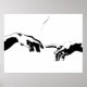 A black and white pop art style version of "The Creation of Adam" by Michelangelo. The original was painted on the ceiling of the Sistine Chapel and depicts God's creation of the first man, Adam, as told in Genesis.