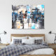 A vibrant city skyline is depicted in bold abstract style, featuring a mix of blues, oranges, and blacks. Dynamic brushstrokes and geometric shapes create a sense of movement and complexity.