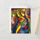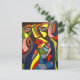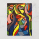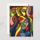 A custom postcard that features a colourful African art painting in red, yellow, green, black, and coral.