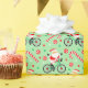 Biking Christmas holiday gift wrap or party decoration featuring merry Santa cyclist cycling pattern.