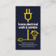 Overleaf, in a similar blue cover, a yellow electrician light bulb logo you can use is at the top. This is followed by the contact details and a slogan option to advertise your business.