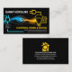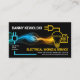 A creative electrical circuit draws power from your prestigious name at the top of the card. The electrical lightning zaps the bulb that contains the "electrician" filament. Below this lies the business name in yellow and its contact details. Near the left wall of the card is a slogan caption to publicise your business. You can change the caption remarks "call me for a free quotation" to suit your own service needs.
