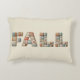 A cosy decorative pillow featuring the word “FALL” spelled out in bold faux quilted patchwork letters. Each letter is made of different fabric patterns in warm autumn tones like orange, brown, teal, and cream, creating a rustic farmhouse and seasonal feel.