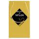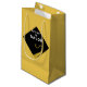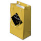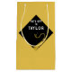 Graduation gift bag featuring black grad cap design on gold background. Edit text to add senior class grad's name.