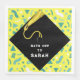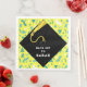 Personalised graduation party napkins for the Class of 25 grad featuring black graduation cap and gold tassel on teal blue and yellow confetti background. Edit text to add his or her name.