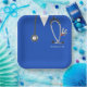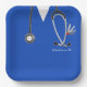 Unique nursing school grad party plates featuring blue scrubs, stethoscope and funny Swiss Army knife. Edit text to add nurse's name.