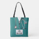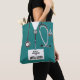 Unique nurse bag featuring hospital scrubs, funny Swiss army knife, and a stethoscope. Edit text to add name and nursing credentials.