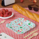 Unique volleyball themed holiday party plates featuring Santa volleyball player surrounded by Christmas treats.