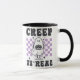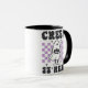 Behind the ghost is a captivating purple and white chequered wall, adding depth and a pop of colour to the design. The chequered pattern brings a playful and whimsical element, enhancing the festive feel of the mug. The contrast between the bold black lettering and the vibrant background makes the design stand out, ensuring that every sip is a celebration of Halloween spirit.
