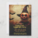 This Halloween party invitation features a creepy and eerie design centred around a sinister clown with a pumpkin face. The clown's unsettling carved pumpkin head is topped with a black hat, giving it an ominous and mysterious appearance. The grin on the pumpkin face is twisted and menacing, with glowing eyes that enhance the spooky vibe. The background is a dark, creepy forest with black, twisted trees that seem to close in around the figure, adding to the unsettling atmosphere. The colour scheme blends deep, shadowy blacks with haunting orange hues that complement the pumpkin face, creating a truly eerie scene.