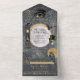 Creepy and cool but still elegant, Celestial Gothic Misty full Moon Wedding All in One Invitations that include the wedding info, RSVP, and meal choices postcard that your guests tear off and and send. Envelopes are not needed. These feature faux gold moon, skull with top hat, Victorian clock, bat, skeleton hands, ravens, branches, shimmery gold dust and a watchful eye. Great for an evening, dark and moody, mystical, gothic, halloween or a moonlight wedding!