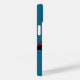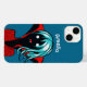 Cute goth personalised iPhone case with a digital illustration of a funny dark skinned undead character with glowing eyes, blue hair, fans and vibrant red cape over dark blue background. Fun design great for Halloween.