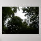This beautiful print features a photograph taken from within a dense forest. The photograph shows the darkness of the trees and a small area of grey sky. The result is an eerie and atmospheric scene.