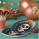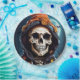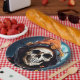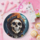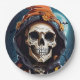Paper plates with an illustration of a skeleton wearing a hooded jacket with an orange witch's hat on top. Surrounded by cute and spooky pumpkins. A glowing moon in the back with a single bat flying nearby. Fun autumn Halloween design.
