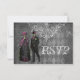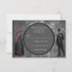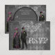 Cool and creepy Halloween formal RSVP wedding flat cards with a fantastic Gothic horror skeleton bride and groom. The bride is dressed in a beautiful vintage black, pink and green wedding gown with flowers and butterfly ornaments. The groom is stylish in his top hat, tails and cane. The background is an elegant vintage goth black, grey and white shabby chic collage with ornate white scroll decorations, a dragonfly, antique faded writing and stylish harlequin pattern. On the reverse of these funky goth invites is a glamourous printed black pearls and lace mat with text for you to personalise with your event details. Classy, trendy fun invites. I have matching products in my store. All of the text can be easily customised to meet your needs and you can change the font style, colour and size of font if you desire. If you need any assistance customising your product please contact me through my store and I will be happy to help. Pearl mat by ©Hazel Kinvig-Paul www.design-a-dream.co.uk Please note - all invites on Zazzle have flat printed images.