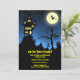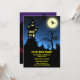 A scary haunted house perched on top of a hill with a grave yard against a dark blue sky. There's a full moon with a wicked witch flying across it. Very fun and scary design for your Halloween party invitations.
